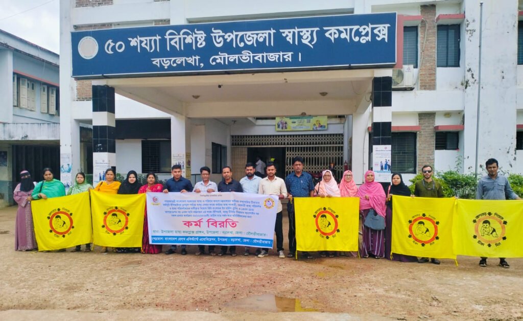 শনিবার (৪ অক্টোবর) সকাল থেকে বড়লেখা উপজেলার সব ইউনিয়নের স্বাস্থ্য পরিদর্শক, সহকারী স্বাস্থ্য পরিদর্শক ও স্বাস্থ্য সহকারীরা উপজেলা স্বাস্থ্য কমপ্লেক্স চত্বরে অবস্থান কর্মসূচি শুরু করেন।