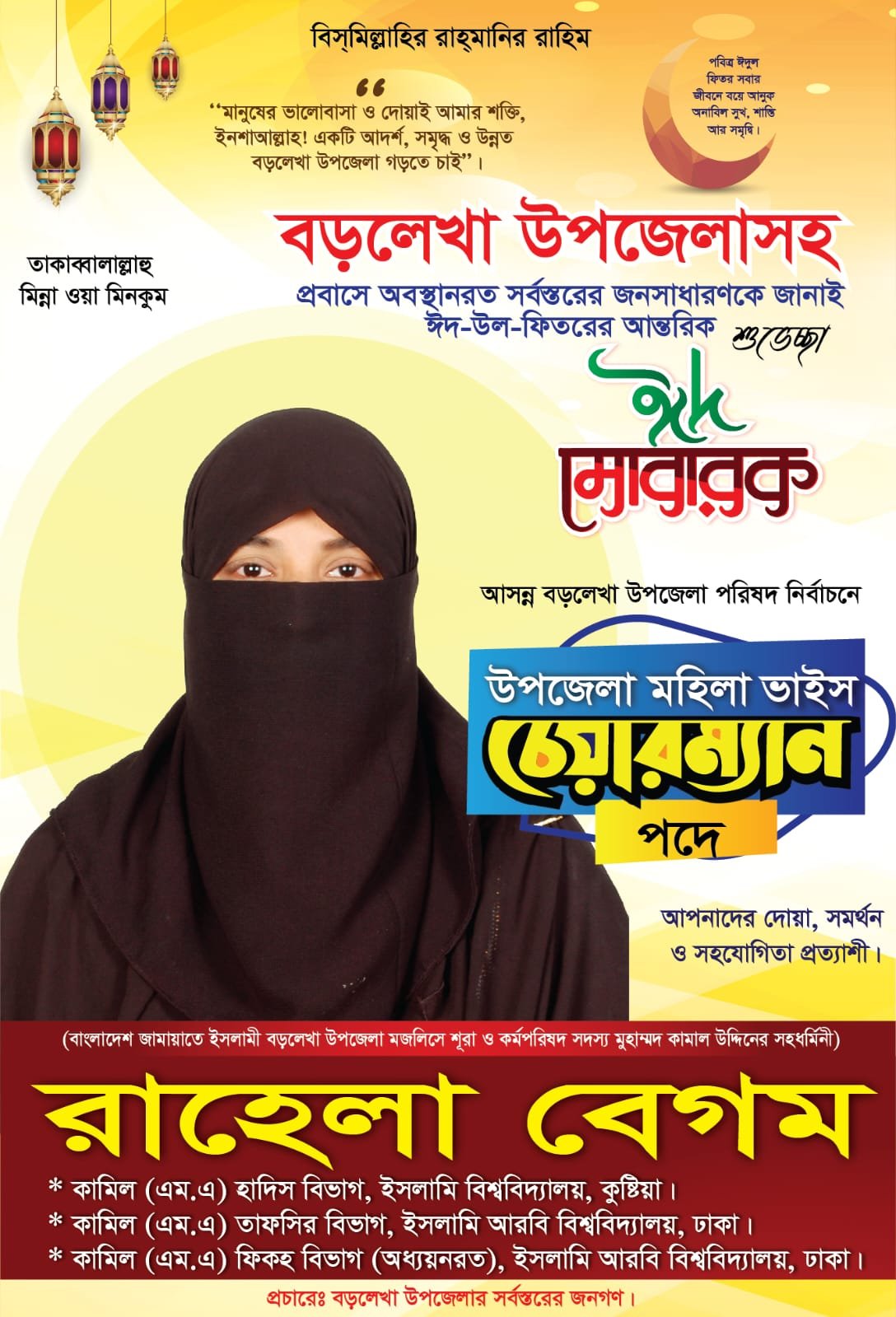মৌলভীবাজারের বড়লেখা উপজেলায় পবিত্র ঈদুল ফিতর উপলক্ষে সম্ভাব্য উপজেলা মহিলা ভাইস চেয়ারম্যান পদ প্রার্থী ও সমাজসেবী রাহেলা বেগম সর্বস্তরের জনগণকে আন্তরিক শুভেচ্ছা ও মোবারকবাদ জানিয়েছেন।